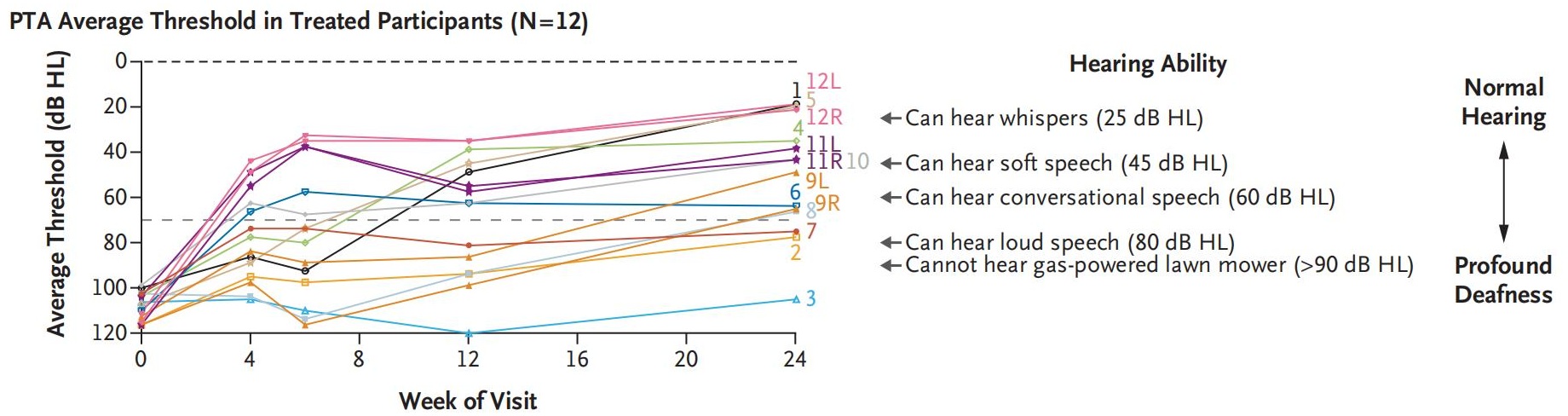 该研究共纳入12 名患儿,单次手术输注DB-OTO后,有9名儿童(75%; 95% CI, 43-95; P=1.1×10−13)在第24周纯音测听检查(PTA)平均听力阈值≤70dBnHL及听性脑干反应听力阈值≤90dBnHL。6名受试者可以在没有辅助设备的情况下听到轻柔的语音。3名受试者平均听力敏感度达到正常。在治疗期间或治疗后共发生67起不良事件,17起与通过手术给药有关,所有不良事件均短暂发生,未发现与持续前庭失调表现有关的不良事件(Vassili Valayannopoulos., 2025)。