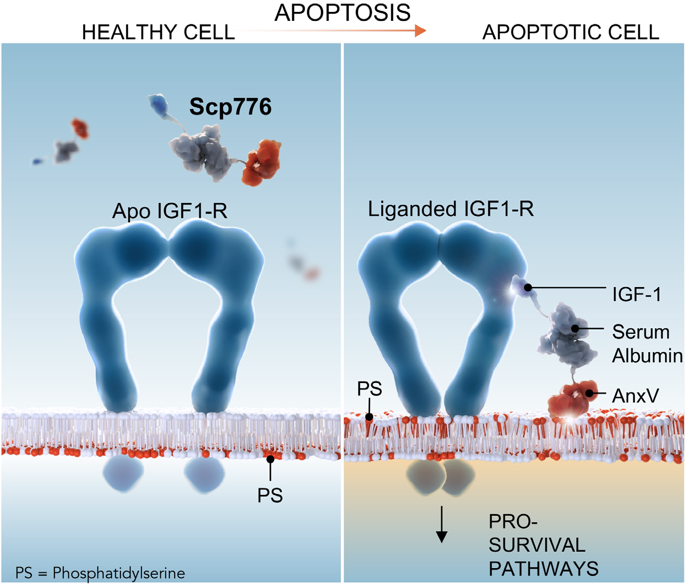 scp776为IGF-1(胰岛素样生长因子1)融合蛋白药物,scp776包括3个结构域,Annexin V(膜联蛋白A5)识别臂、白蛋白支架和IGF-1效应臂。Annexin V识别臂能够识别活梗死部位凋亡细胞膜外翻的磷脂酰丝氨酸(PS),使scp776在梗死部位富集,防止脱靶效应。白蛋白(HSA)支架,除了连接识别臂和效应臂之外,能够延长scp776在体内的作用时间。IGF-1效应臂通过激活凋亡细胞IGF-1受体,阻止细胞发生凋亡(Samuel J Pfaff., 2025)。