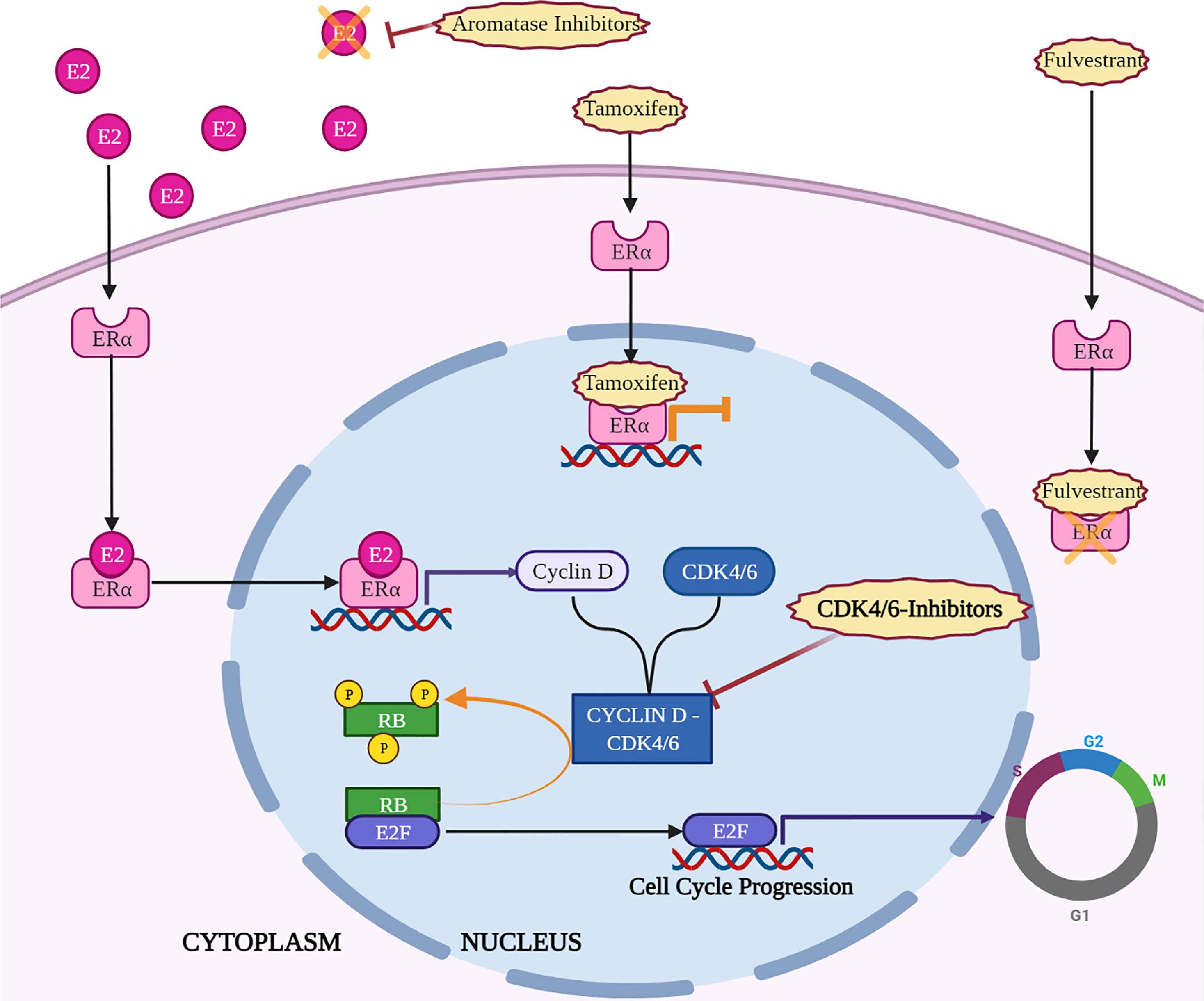 瑞波西利(Ribociclib)为选择性细胞周期蛋白依赖性激酶4和6(CDK4/6)抑制剂。CDK4/6抑制剂主要用于HR+/HER2-乳腺癌。CDK4/6通过磷酸化Rb(成视网膜母细胞瘤蛋白)推动细胞周期G1期向前进展。HR+乳腺癌赖雌激素受体(ER)介导的周期蛋白D1上调,激活CDK4/6,使HR+乳腺癌对于CDK4/6敏感。激活HER2信号通路能够绕开CDK4/6,因此HER2-强化了HR+乳腺癌对于CDK4/6的敏感性(Tong Gao., 2025)。