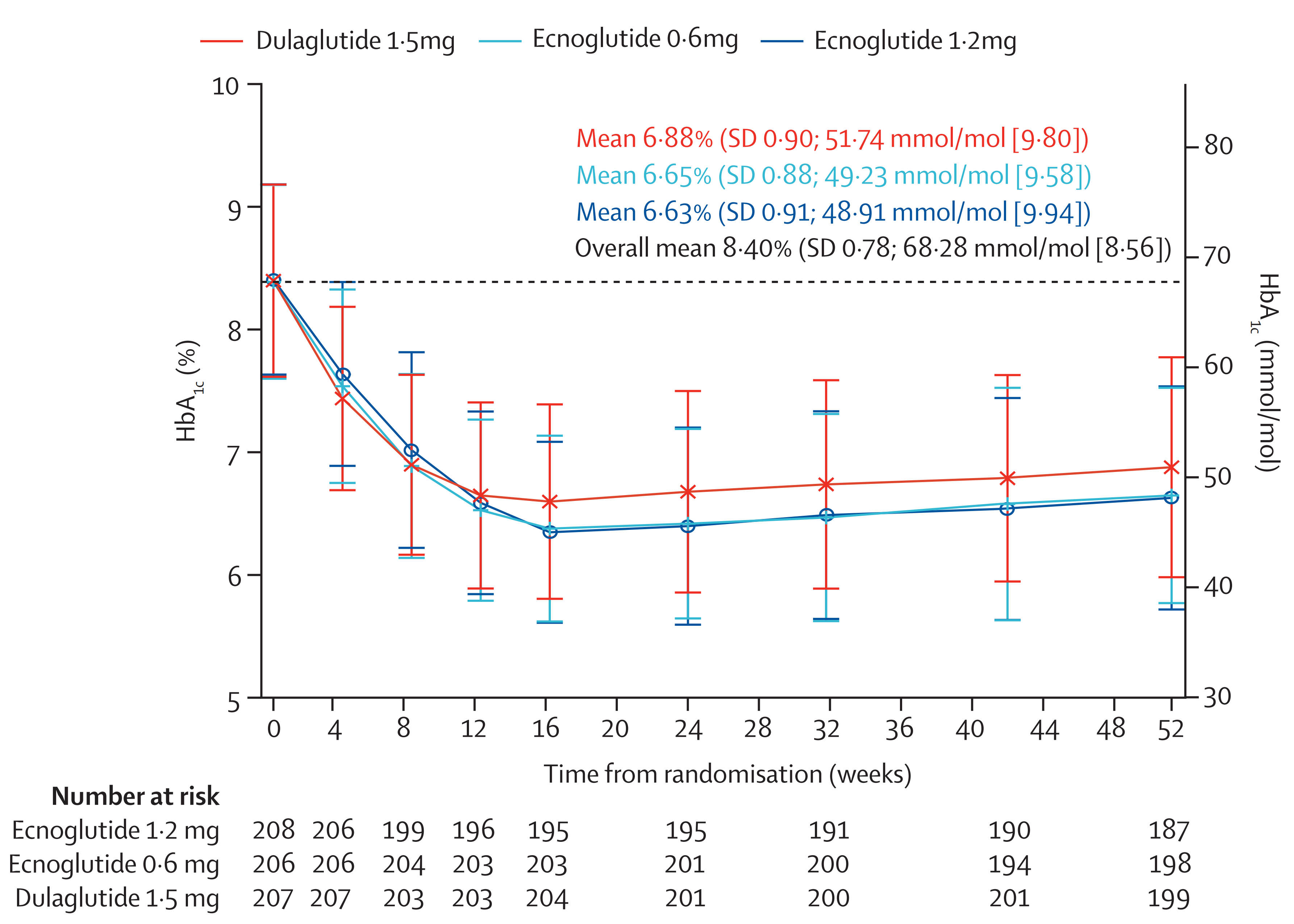 EECOH-2研究为多中心、随机、开放标签、、阳性对照3期临床试验,共纳入623名单用二甲双胍控制不佳的成年2型糖尿病患者。组患者按1:1:1比例随机接受埃诺格鲁肽注射液目标剂量0.6mg、1.2mg,或度拉糖肽(Dulaglutide)1.5mg,每周一次皮下注射,治疗52周。埃诺格鲁肽的起始剂量为0.3mg,每4周调整一次给药剂量,直至目标剂量(滴定剂量0.6mg、1.2mg)。至第32周,埃诺格鲁肽0.6mg组、1.2mg组和度拉糖肽组与基线相比HbA1c平均降幅分别为1.91%、1.89%和1.65%。相对于度拉糖肽,埃诺格鲁肽0.6mg组、1.2mg组HbA1c平均降幅分别为0.26%和024%(p<0.0002)。至第52周,埃诺格鲁肽0.6mg组、1.2mg组和度拉糖肽组与基线相比HbA1c平均降幅分别为1.72%、1.76%和1.50%。相对于度拉糖肽,埃诺格鲁肽0.6mg组、1.2mg组HbA1c平均降幅分别为0.22%(p<0.0025)和025%(p<0.0006)。埃诺格鲁肽0.6mg组、1.2mg组和度拉糖肽组达到HbA1c≤6.5%的比例分别为51%(105/206)、50%(106/208)和35%(73/207)。相对于度拉糖肽,埃诺格鲁肽0.6mg组、1.2mg组达到HbA1c≤6.5%的比例分别增加16%(p<0.0009)和15%(p<0.0017)。埃诺格鲁肽0.6mg组、1.2mg组和度拉糖肽组达到HbA1c≤5.7%的比例分别为10%(20/206)、11%(22/208)和4%(9/207)。相对于度拉糖肽,埃诺格鲁肽0.6mg组、1.2mg组达到HbA1c≤6.5%的比例分别增加5%(p<0.030)和6%(p<0.015)。 在降低体重方面,埃诺格鲁肽0.6mg组、1.2mg组和度拉糖肽与基线相比体重降幅分别达到5.23%、5.74%和2.92%。在安全性方面,埃诺格鲁肽0.6mg组、1.2mg组和度拉糖肽组分别有6人(3%)、8人(4%)和6人(3%)因不良事件停止治疗(Yang He., 2025)。