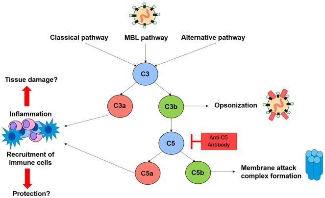 Vilobelimab为抗C5a单克隆抗体,通过靶向补体因子C5a,抑制C5a介导的炎症反应。C5a处于补体系统的下游,不影响补体系统形成针对病原体的膜攻击复合物。