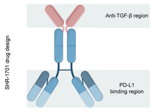 瑞拉芙普α(Retlirafusp alfa,SHR-1701)为抗PD-L1单克隆抗体与转化生长因子β受体Ⅱ(TGF-βRⅡ)胞外域融合蛋白。一方面通过阻断PD-L1作用于PD-1,阻止肿瘤发生免疫逃逸,另一方面通过TGF-βRⅡ融合蛋白构成的配体陷阱,阻止TGF-β对肿瘤的促进作用。
